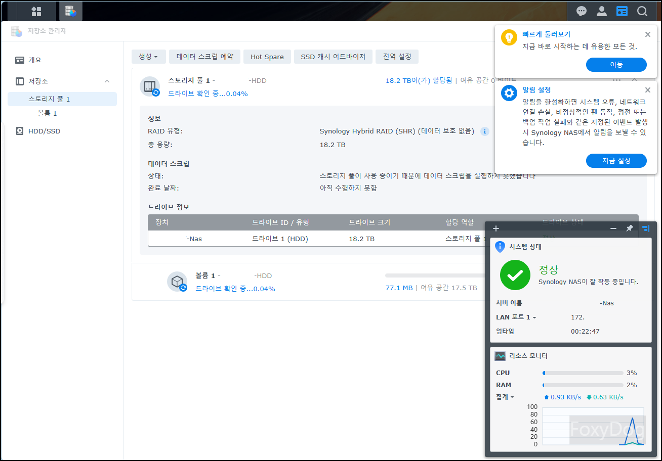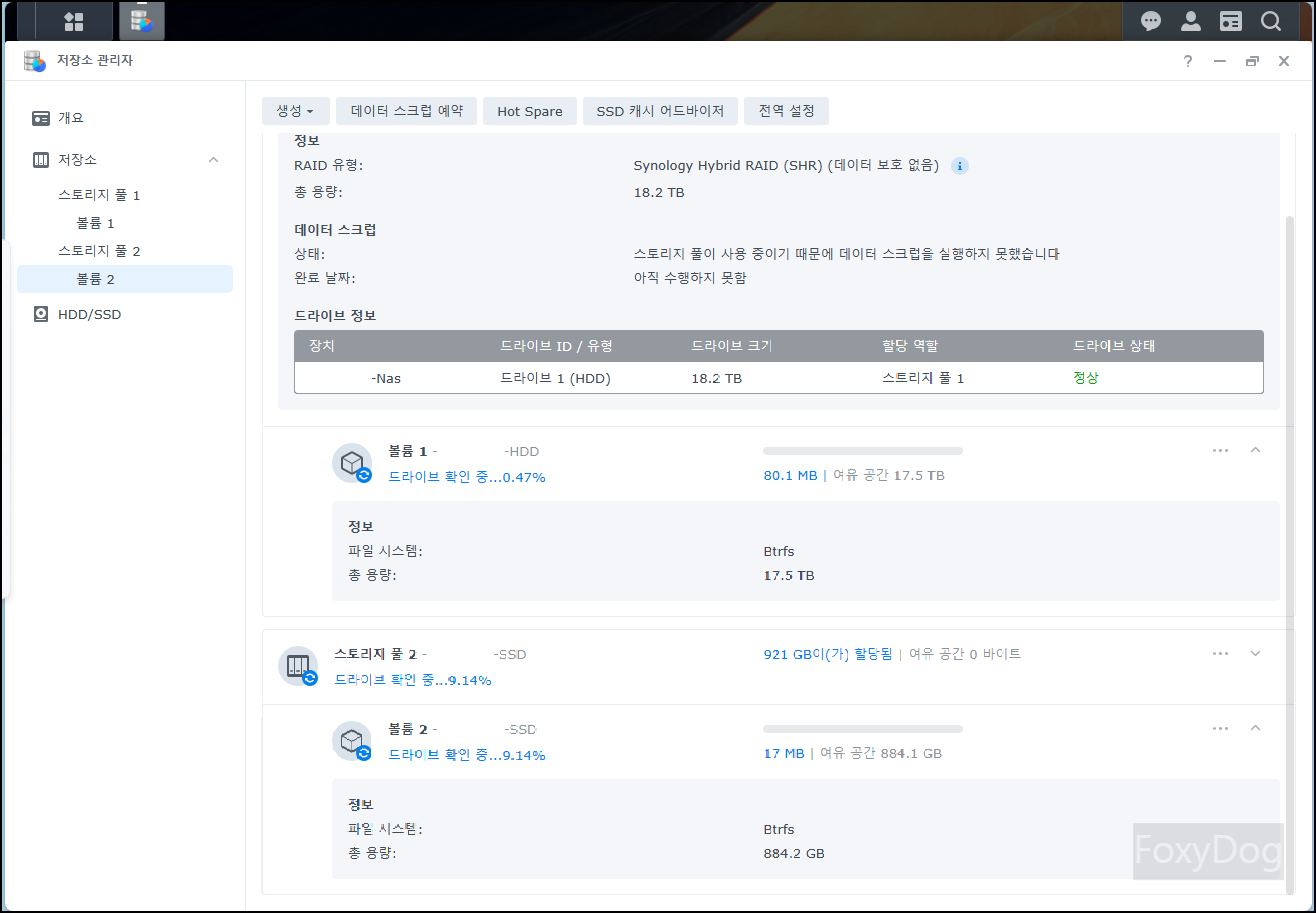 다른 HDD/SSD 하드웨어를 장착해도 스토리지 풀 생성하는데 전혀 문제가 없네요. 각각 독립적인 스토리지로 이용이 가능합니다. HDD는 백업용으로 사용하고 외부 환경에서 큰 데이터를 받을 때는 빠르게 처리할 수 있는 SSD 쪽으로 저장하면 좋을 것 같습니다.