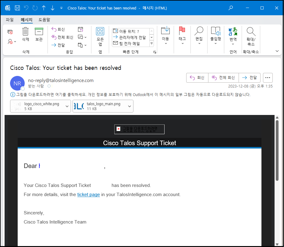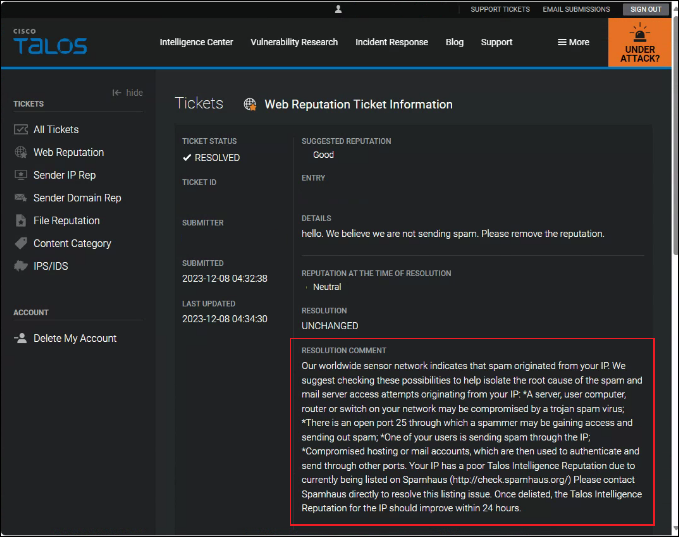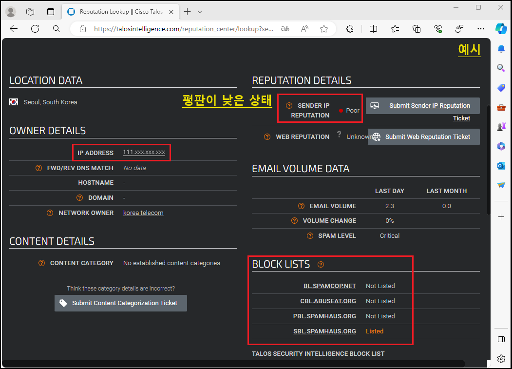 코멘트 : 귀하의 IP는 현재 Spamhaus(https://check.spamhaus.org/)에 등재되어 있어 Talos Intelligence 평판이 좋지 않습니다. 이 등재 문제를 해결하려면 Spamhaus에 직접 문의하세요. 목록에서 삭제되면 해당 IP에 대한 Talos Intelligence 평판은 24시간 이내에 향상됩니다.
