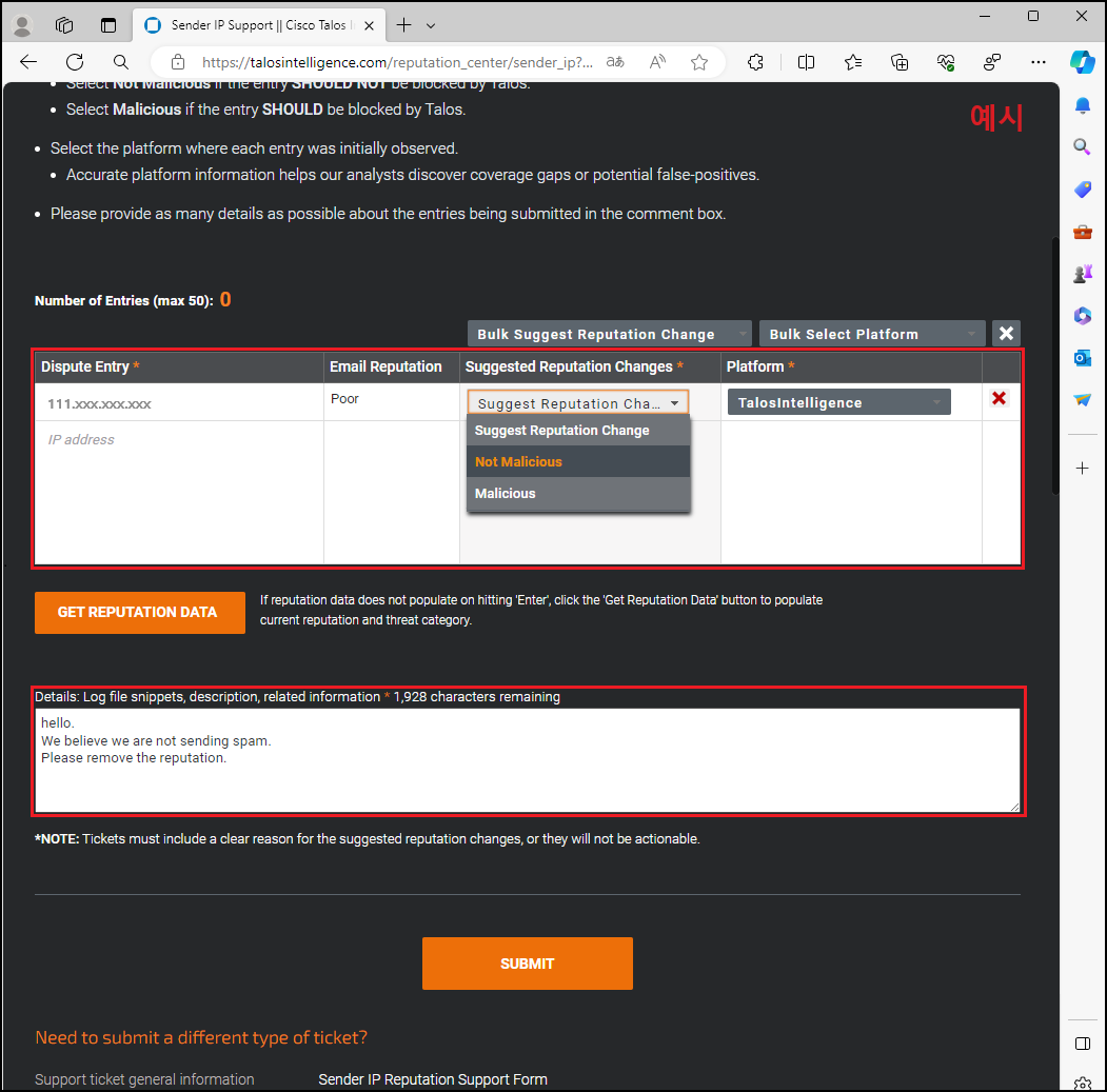 Details「세부 정보」 : 부분은 「로그 파일 일부분」 「설명」 「관련 정보」를 2000자 내로 작성하면 되는데, 차단된 사유를 모르겠다면 간단하게 평판 차단 해제 조정 요청을 적어 넣습니다. 스팸관리자는 IP 정보만 알아도 대체로 차단 사유를 파악할 수 있습니다.