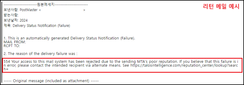▣ 리턴 메시지에 「MTA's poor reputation」와 URL 주소에 「talosintelligence」 문구가 들어가 있으면 수신 측 메일서버가 「Cisco」의 인텔리전스「TALOS intelligence」 서비스를 받고 있을 확률이 높습니다. URL 공식 홈페이지를 따라가 보면 알 수 있지만 웹 평판「악성 도메인, URL, IP」뿐만 아니라 발신자 메일서버 평판「IP와 도메인」도 하고 있으므로 여기에 걸리면 발송자 메일서버의 모든 메일을 차단합니다.