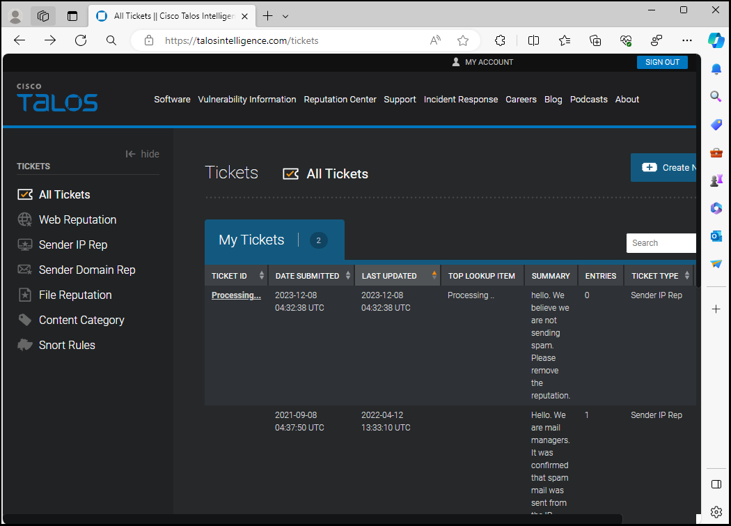 Talos는 기타 인기 있는 외부 스팸 차단 목록에 대한 무료 조회 기능을 제공합니다. 이는 Talos Reputation Center를 사용하여 배송문제를 보다 쉽게 해결할 수 있도록 하기 위한 것입니다. 외부 차단목록에 호스트가 나열되어「Listed」 있는 경우 해당 목록에서 시스템을 제거하려면 해당 호스트와 협력해야 합니다.