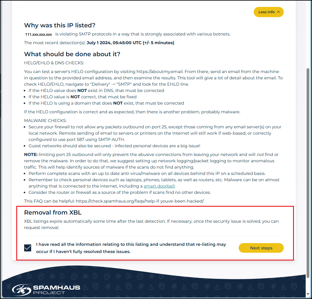 「Removal from XBL」 버튼이 무조건 활성화되어 있는 건 아닙니다. 만약 IP 평판이 최악일 경우 일정시간이 지나야 해제를 할 수도 있습니다. 그나마 조정의 여지가 있다면 위와 같이 바로 즉시 제거 요청이 가능합니다. 「SBL/PBL」도 있다면 동일합니다.
