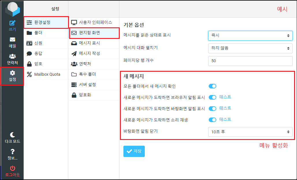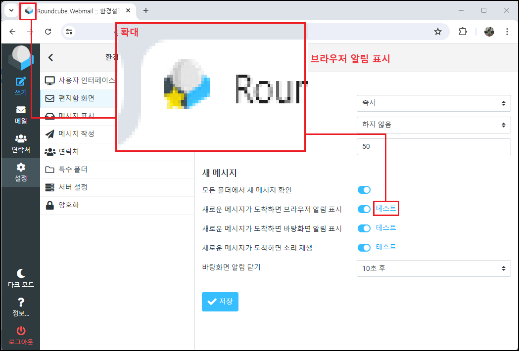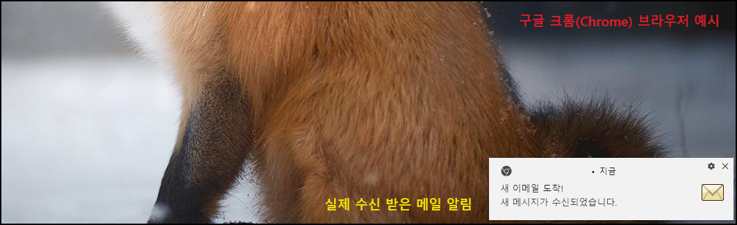 또한 알림 기능은 최근 보안 때문에 기본적으로 알림 창을 차단하는 경우가 대다수입니다. 차단되었다는 팝업창이 뜨면 접속하시는 메일서버의 URL 호스트 주소를 허용해야 합니다.