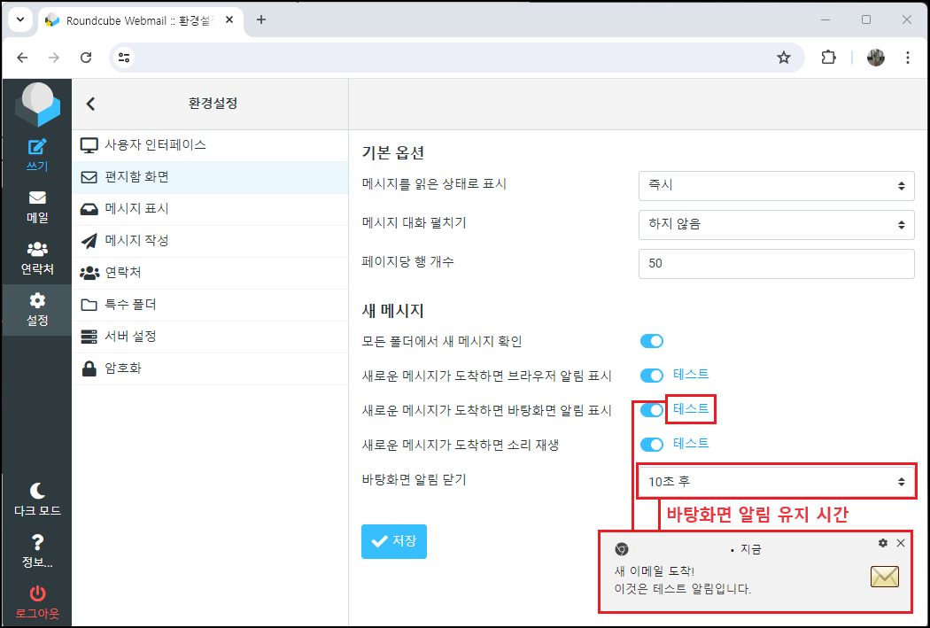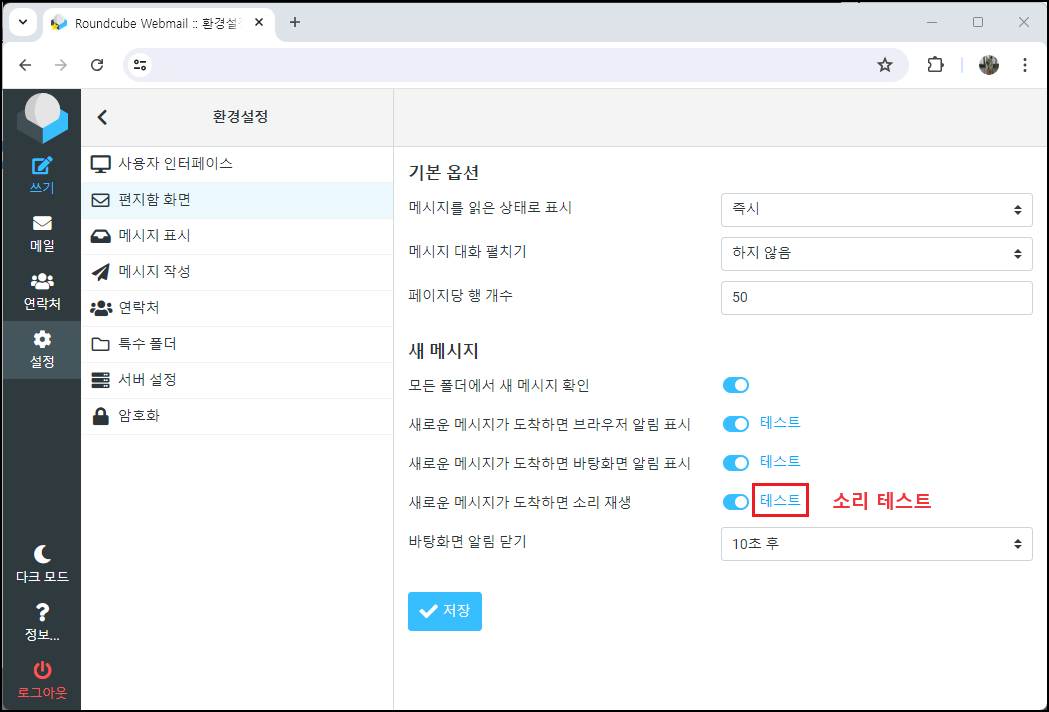 새로운 메일을 수신받지 않아도 옆에 「테스트」 버튼을 클릭하면 정상 작동되는지 바로 테스트 확인이 가능합니다.