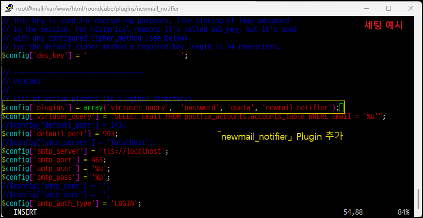 $config['plugins'] = array('virtuser_query', 'newmail_notifier'); [추가]