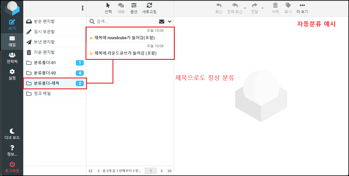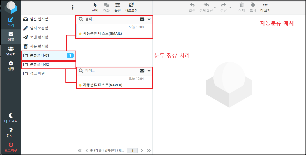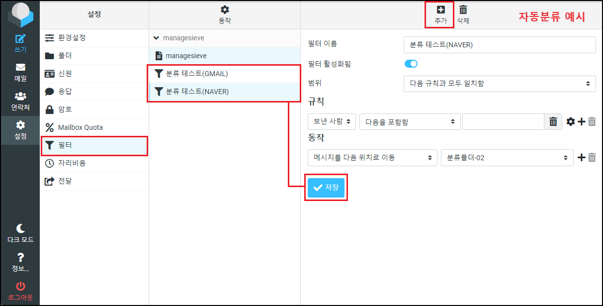 ※ 자동분류는 등록된 순서대로 처리를 합니다. 사용자들이 가장 많이 실수하는 부분이 많이 등록될수록 분류조건이 중복되거나 잘못된 조건으로 인해 다른 폴더로 이동되거나 메일이 중복 또는 삭제 등의 문제가 발생할 수 있습니다. 자동분류는 신중히 등록하시길 바랍니다.