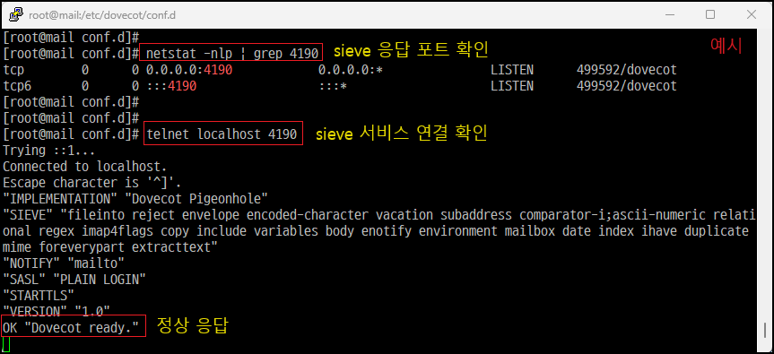 [root@mail ~]# telnet localhost 4190 [sieve 서비스 연결 확인]