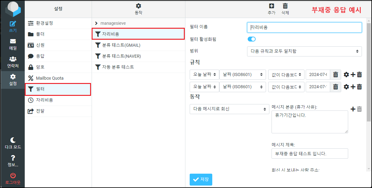 ※ Dovecot 설정파일 「10-mail.conf」에서 설정했던 「mail_location = maildir」 경로와 동일하게 설정해 주면 됩니다. 사용자가 필터 설정을 저장하면 「/home/vmail/Domain/USER/Maildir/」 경로에 「sieve」 폴더가 생기며 설정파일이 생성됩니다.