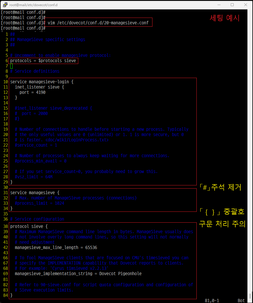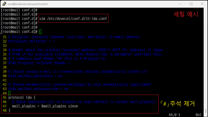 ※ 「#」주석 제거 및 「{ }」 중괄호 구문 처리 주의, 위 설정은 Dovecot LDA 또는 LMTP를 사용하여 수신 메일을 사용자 메일함(사서함)으로 전달해야 하므로 Pigeonhole Sieve 플러그인을 활성화합니다.