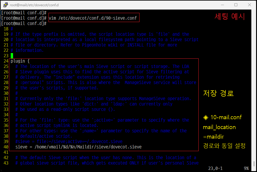 40 sieve = /home/vmail/%d/%n/Maildir/sieve/dovecot.sieve [저장 경로 설정]