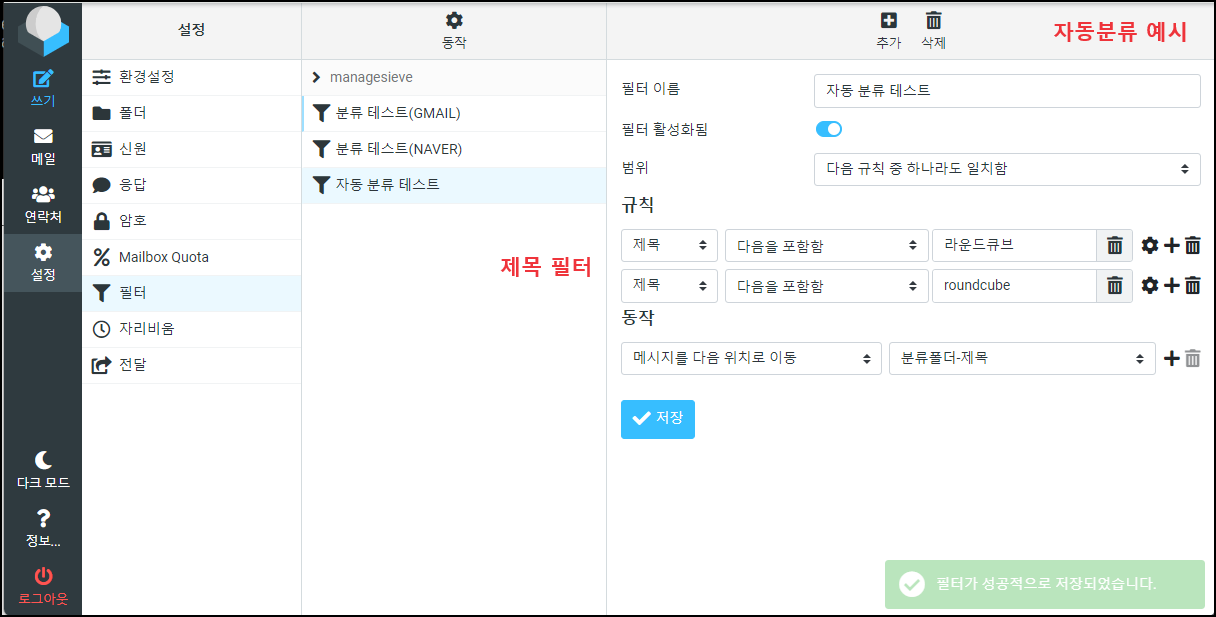 ※ 기본 경로는 ~/roundcube/logs/sieve.log 로그가 쌓임