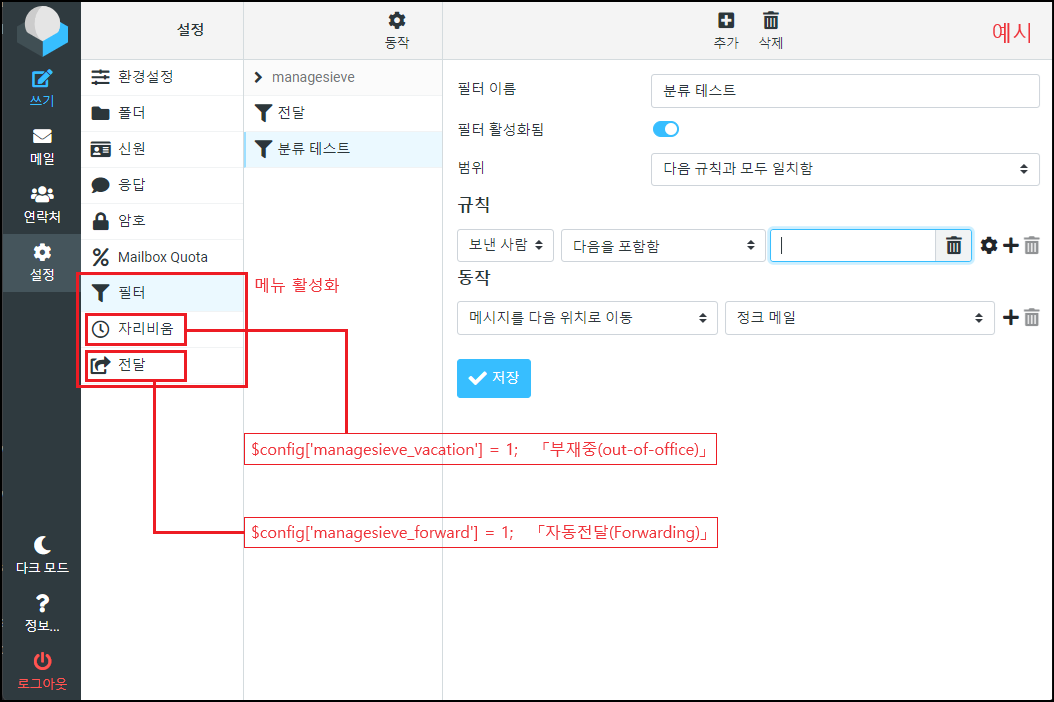 $config['managesieve_forward'] = 1; [※ 자동 전달, 0 → 1 변경]