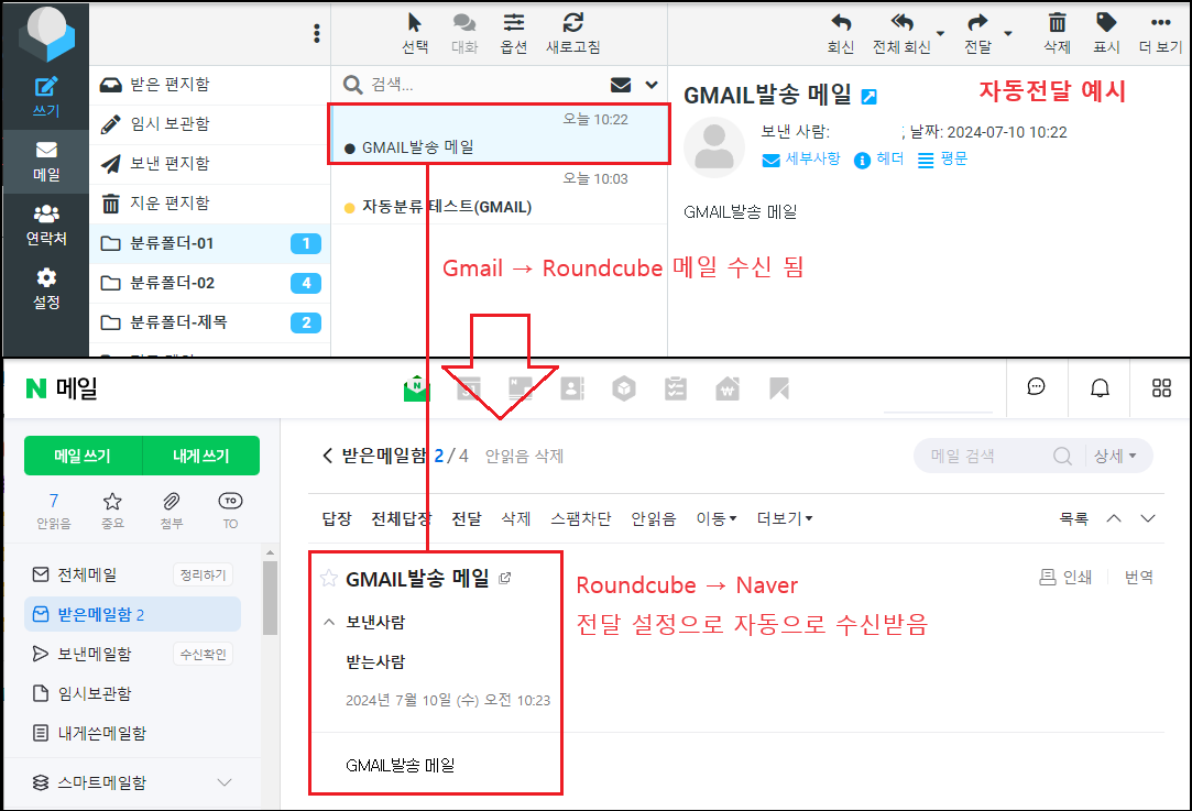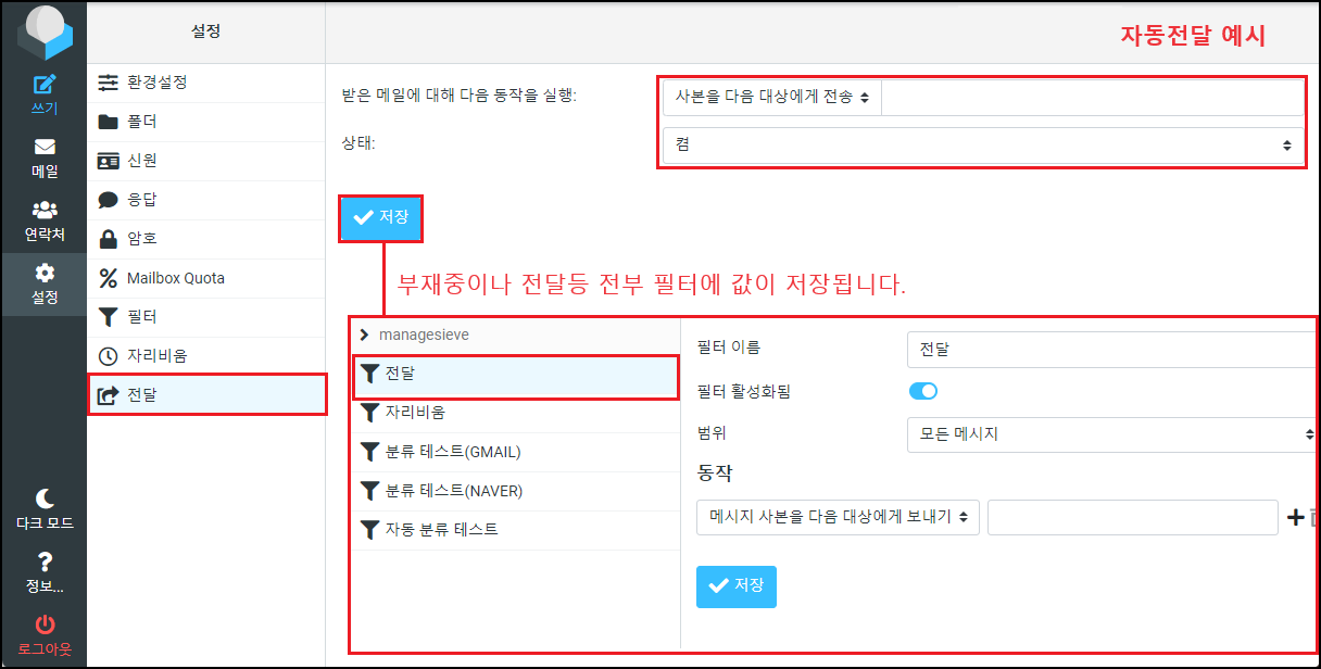 자동전달은 수신받은 메일을 완전히 다른 메일서버의 주소로 전달을 가능하게 합니다. 하지만 여기서 하나 생각해야 되는 부분이 만약 기업메일로 중요한 업무를 보는 사용자라면 문서나 개인정보 같은 게 외부로 유출이 될 수 있는 여지가 있습니다. 또한 수신받은 메일이 스팸메일이라면 다른 서버로 스팸을 발송하는 것과 똑같은 역할을 하게 됩니다. (발송자의 메일주소나 공격자 IP로 차단될 수 있음) / 보안팀에서는 자동전달이 있으면 보안취약으로 간주할 수 있습니다. 순수 개인서버 사용의 목적이라면 적용해도 되지만 기업입장에서는 적용이 필요한지 신중히 검토해 보시기 바랍니다. (유료 솔루션도 마찬가지)