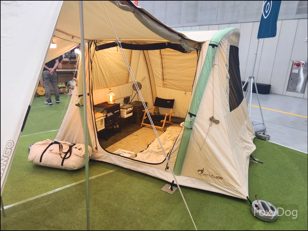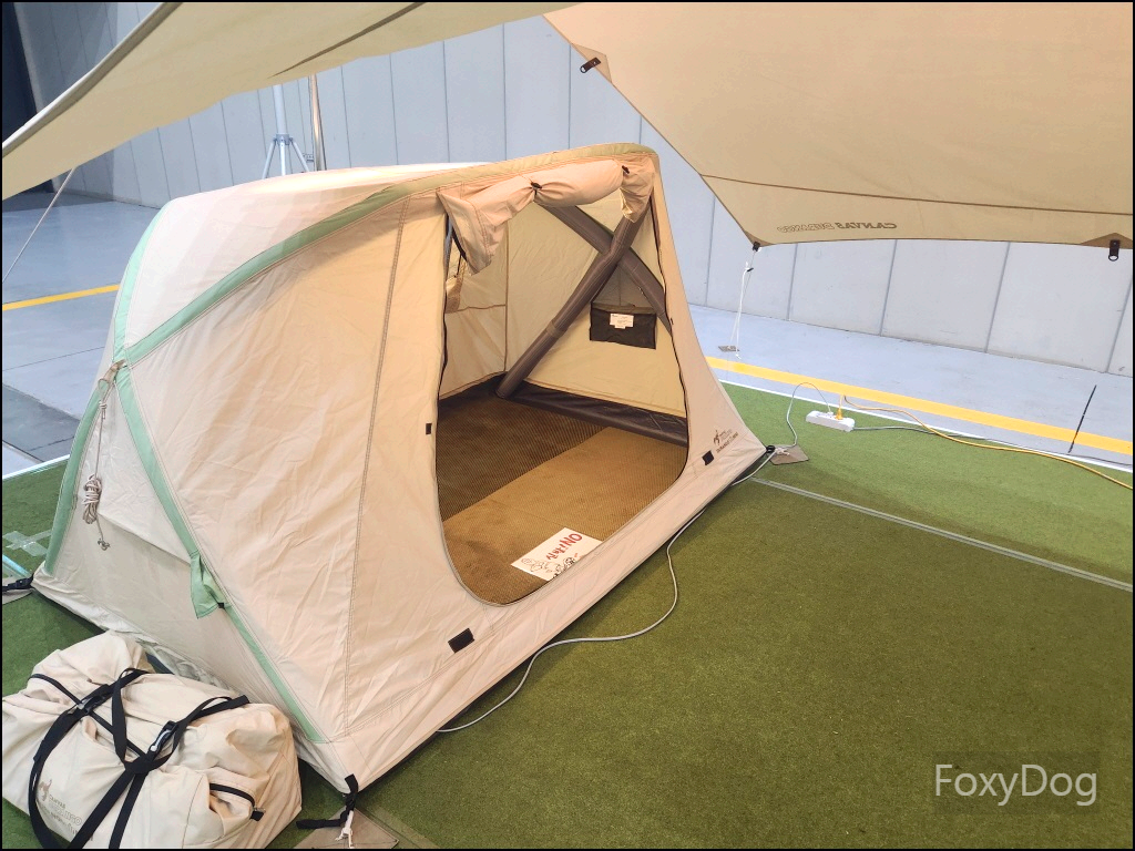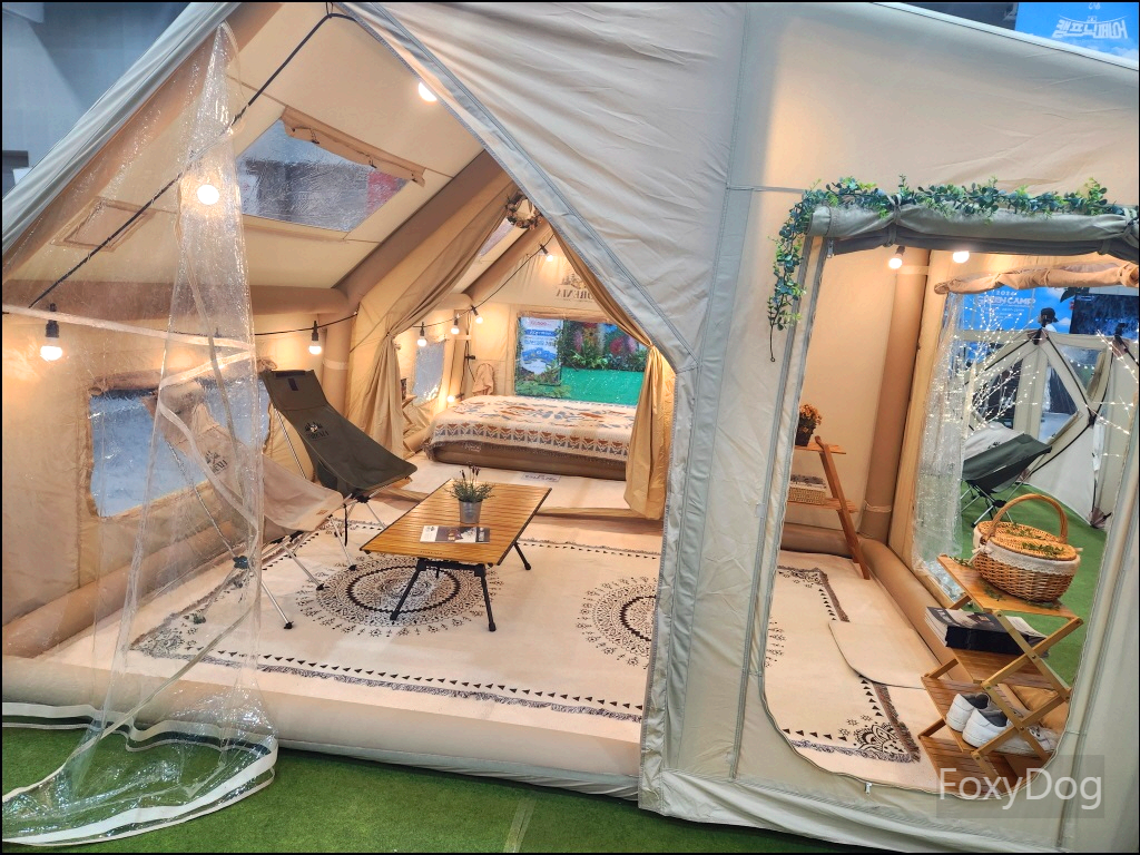 요즘은 또 특이하게 물리적 원터치 텐트가 아닌 「에어 텐트」가 많이 보인다. 마침 판매자분께서 텐트에 공기를 넣는 시연을 해주셨는데 신기하게 텐트용 폴대 없이 공기만 넣으면 자동으로 바로 텐트가 펼쳐진다. 생각보다 고정력도 좋다. 여유가 있다면 하단의 2인용 에어텐트를 여분으로 가지고 싶다. 하지만 텐트 옆에 가방을 보면 알겠지만 공기가 들어가다 보니 텐트 재질이 튼튼해야 해서 좀 더 두껍고 부피를 많이(에어펌프 포함) 차지하는 것 같다. 또한 우천 시 단독으로 사용하지 못하는 단점이 있다. 쉘터 또는 거실형 텐트의 이너텐트용으로 사용하거나 집이 넓으면 난방용 텐트로는 괜찮은 선택일 것 같다. 관심이 있다면 듀랑고 에어 미니「DURANGO AIR MINI」 텐트로 검색하면 된다.