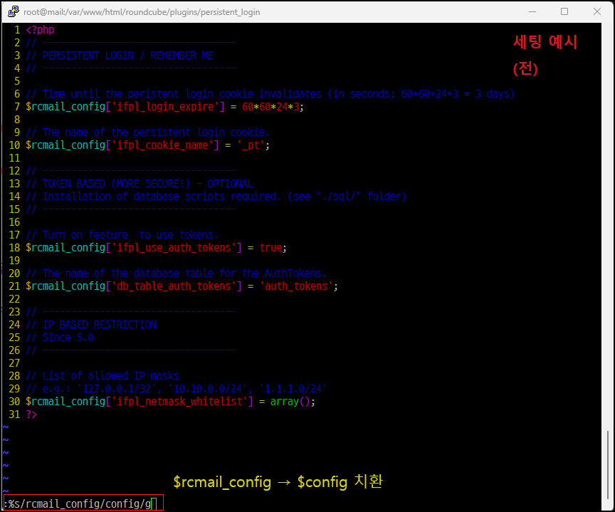 ※ 기본 값 「$rcmail_config」은 사용하지 않으므로 → 「$config」으로 변경이 필요합니다. vi/vim 명령 프롬프트에서 「:%s/rcmail_config/config/g」 입력하면 자동으로 치환됩니다.