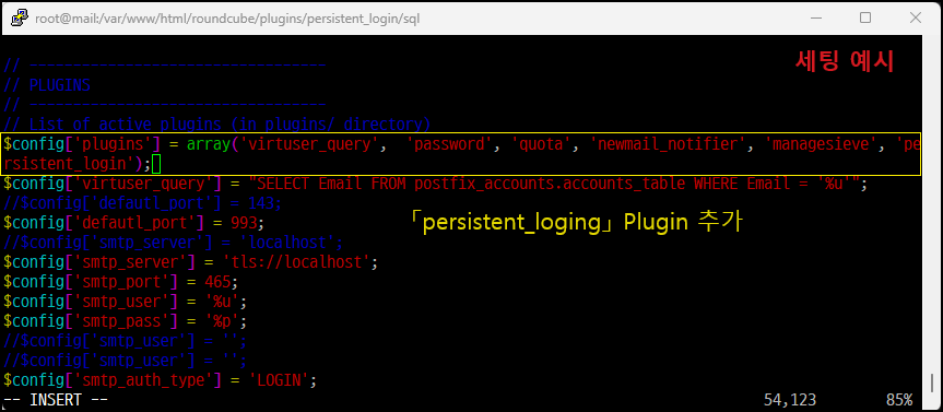 $config['plugins'] = array('virtuser_query', 'persistent_login'); [추가]