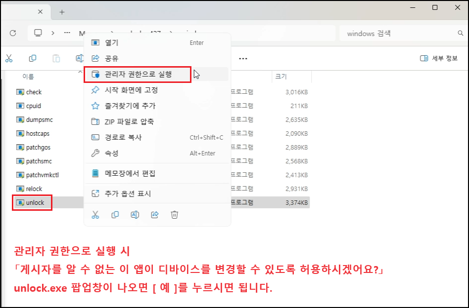 그리고 다운로드한 「unlocker427.zip」 파일을 압축 해제 후 「Windows」 폴더 내의 「unlock.exe」 파일을 실행합니다. ※ 게시자를 알 수 없는 이 앱이 디바이스를 변경할 수 있도록 허용하시겠어요?라는 멘트가 나오면 [ 예 ]를 누르면 됩니다.