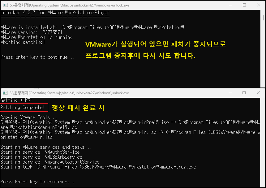 VMware Workstation 프로그램이 실행되어 있으면 패치가 중지됩니다. 실행되어 있다면 프로그램 중지 후에 다시 관리자 권한으로 「unlock.exe」을 실행합니다. 정상적으로 패치가 되면 「Patching Complete!」 명령 프롬프트가 떨어집니다. 그리고 다시 프로그램을 실행시키면 Mac OS가 Unlock이 되며 리스트에서 나오게 됩니다.