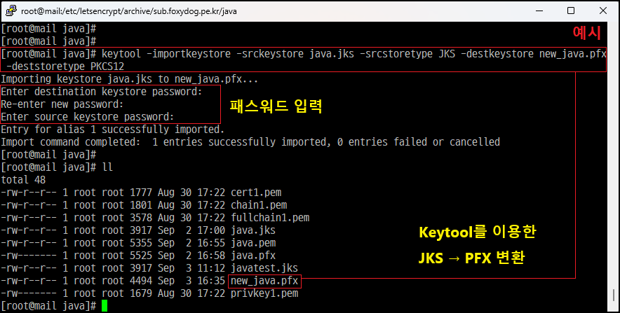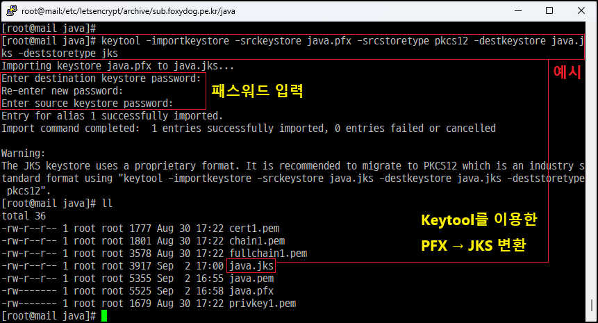 [root@]# keytool -importkeystore -srckeystore java.pfx -srcstoretype pkcs12 -destkeystore java.jks -deststoretype jks [JKS 변환, 전체 한 줄]