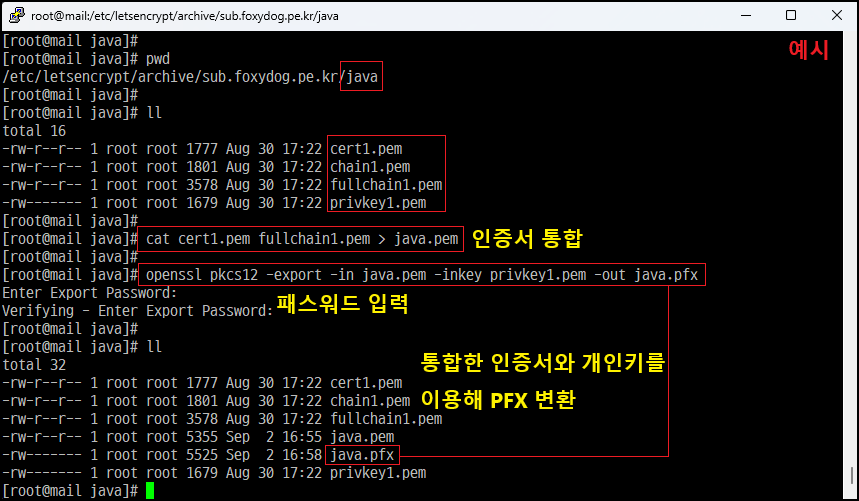 예시 1. [root@]# cat cert1.pem chain1.pem root_ca.pem > java.pem