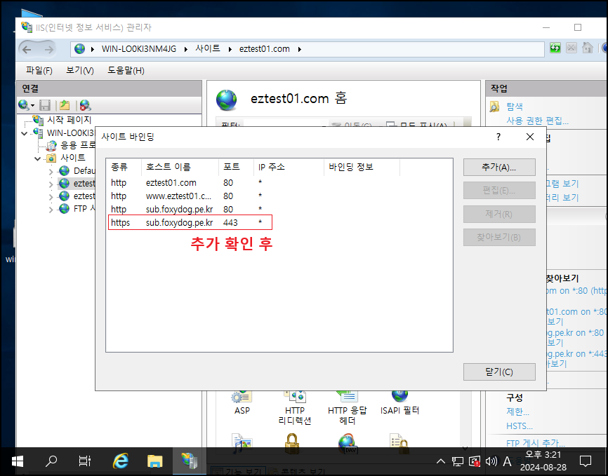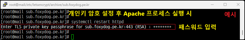 Enter TLS private key passphrase for sub.foxydog.pe.kr:443 (RSA) : [패스워드 입력]