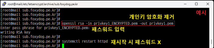 발급 업체 홈페이지에서 CSR자동생성으로 했다면 개인키에는 암호를 설정하지 않습니다. 서버에서 수동으로 CSR생성으로 하셨을 경우에는 미리 개인키에 암호 설정을 하게 됩니다. 그러나 인증서에 개인키 암호는 크게 의미가 없습니다. 암호가 설정되어 있으면 괜히 웹서비스 구동(재시작)할 때마다 암호를 물어보며 잊어버리면 당황할 수 있기 때문에 걸려있다면 암호화를 해제하는 게 좋습니다. 아래는 암호화 설정 및 제거 예시 방법입니다.