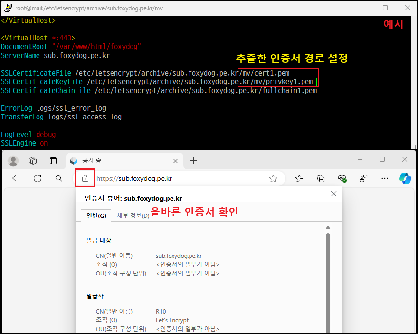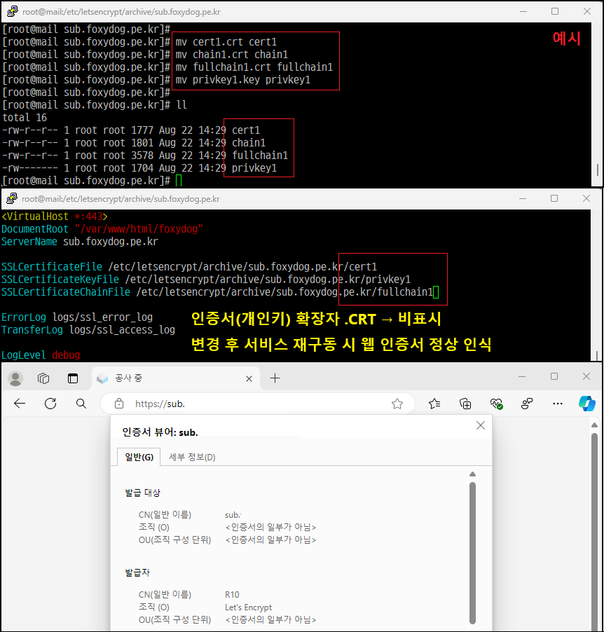 SSLCertificateFile /etc/letsencrypt/archive/sub.foxydog.pe.kr/cert1.pem [인증서 경로 변경]