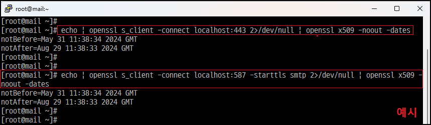 [root@]# echo | openssl s_client -connect localhost:587 -starttls smtp 2>/dev/null | openssl x509 -noout -dates