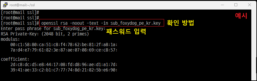 [root@]# openssl rsa -noout -text -in sub_foxydog_pe_kr.key [생성 확인]