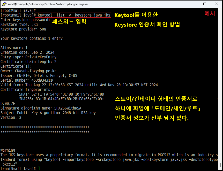 The JKS keystore uses a proprietary format. It is recommended to migrate to PKCS12 which is an industry standard format using "keytool -importkeystore -srckeystore java.jks -destkeystore java.jks -deststoretype pkcs12". 해당 내용은 JKS Keystore는 JAVA에서만 사용하는 독점 형식이라, 산업 표준 형식인 PKCS12로 마이그레이션 하는 게 좋다는 단순 경고문입니다. 필자도 JKS 확장자로 Apache Tomcat이나 JAVA로 개발된 소프트웨어 데몬 환경에만 적용을 해봐서 다른 확장자로 적용을 해본 적이 없네요. 이후 순차적으로 적용해 보겠습니다.
