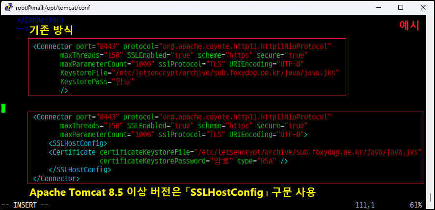 ◇ 기존 방식 : <Connector 구문 내에/> keystoreFile / keystorePass 옵션을 사용 (대소문자 구분함, 주의)
