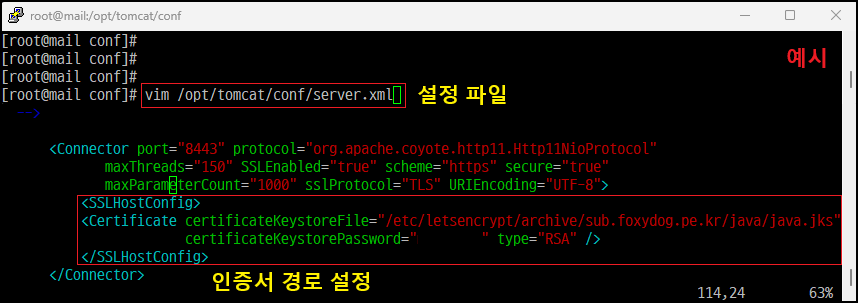 [root@]# vim /설치경로/conf/server.xml [Apache Tomcat 설정 파일 중]
