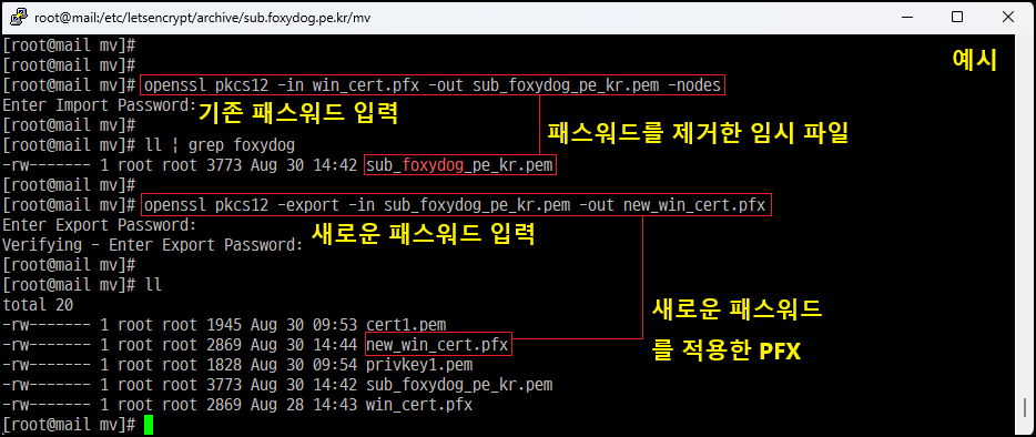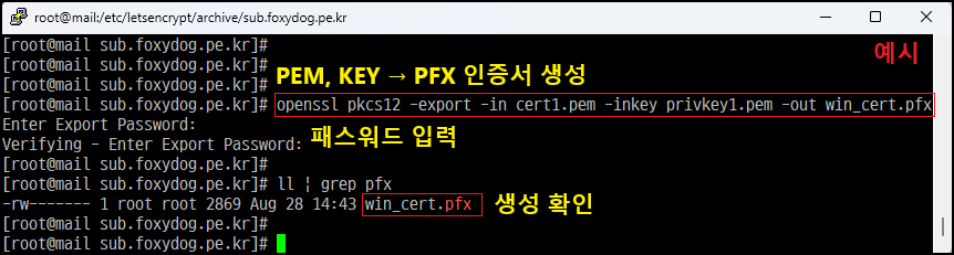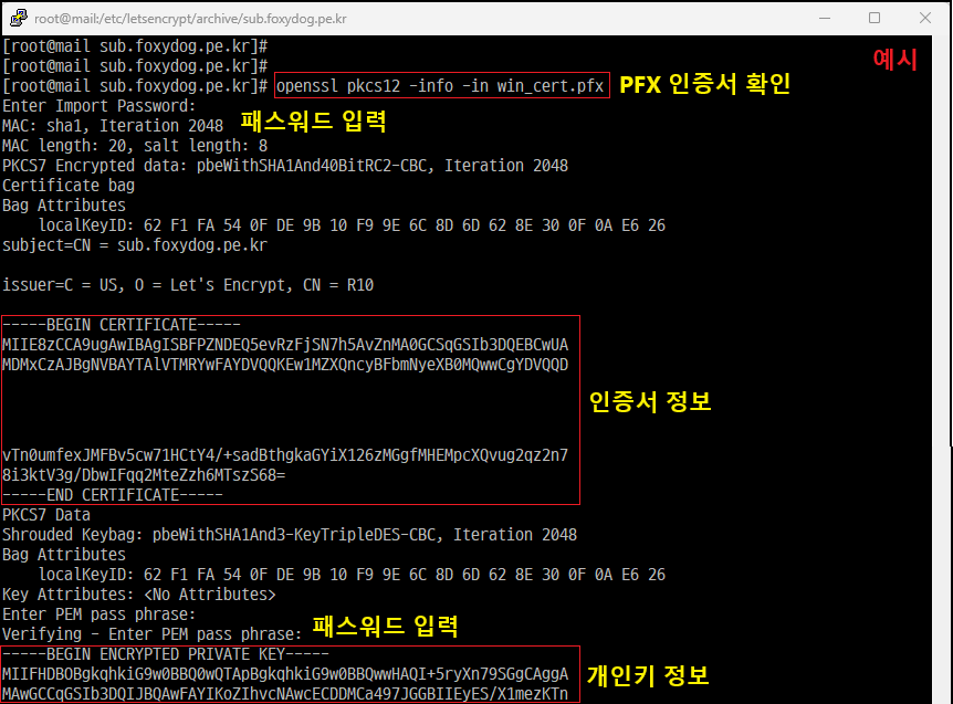 [root@]# openssl pkcs12 -info -in new_java.pfx [인증서 확인]