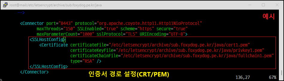 <Certificate certificateFile="/인증서경로/java/cert1.pem"