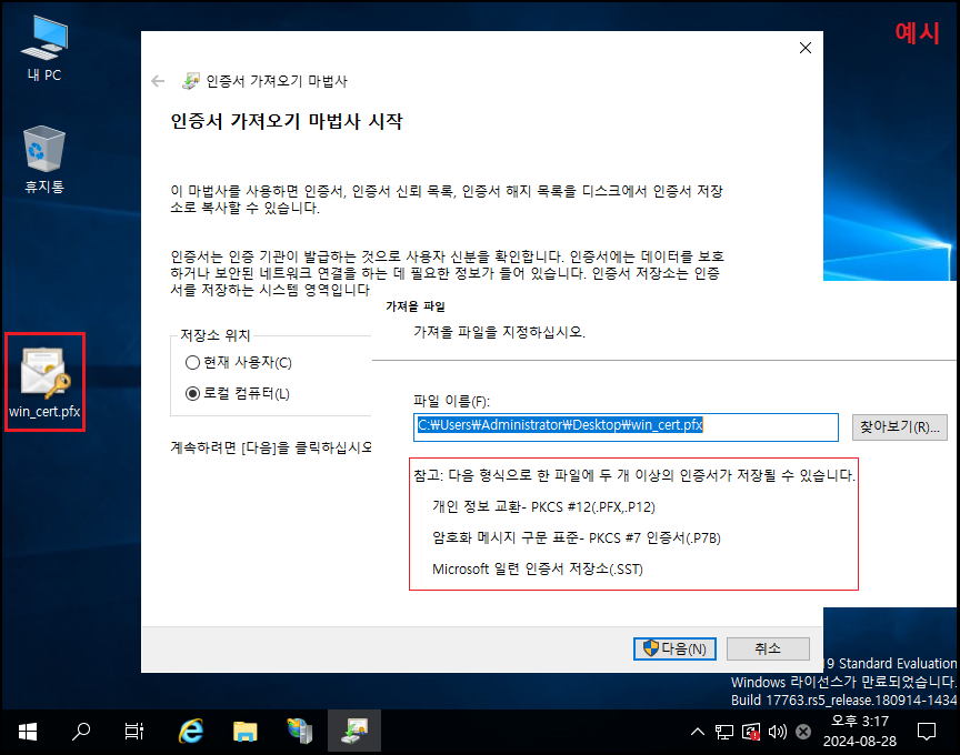 ※ PFX 적용 시 「도메인인증서/체인인증서/루트인증서/개인키」 정보가 모두 포함되어야 합니다.