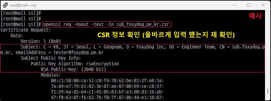 [root@]# openssl req -noout -text -in sub_foxydog_pe_kr.csr [CSR 정보 확인]