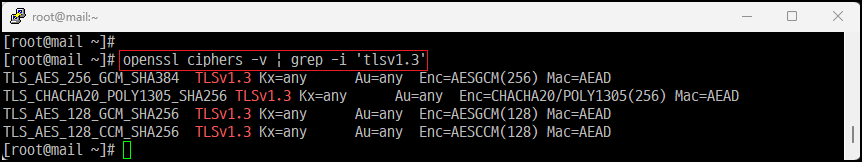 [root@mail ~]# openssl ciphers -v | grep -i 'tlsv1.3'