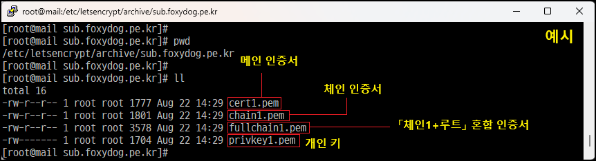 [root@]# ll /etc/letsencrypt/archive/sub.foxydog.pe.kr [Let's Encrypt 인증서 발급 위치]