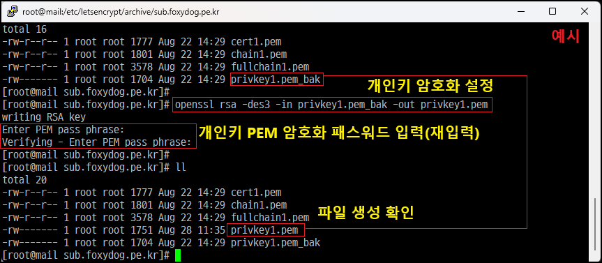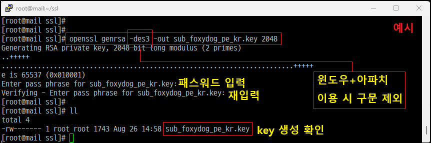 [root@]# openssl genrsa -des3 -out sub_foxydog_pe_kr.key 2048 [개인 키 생성]