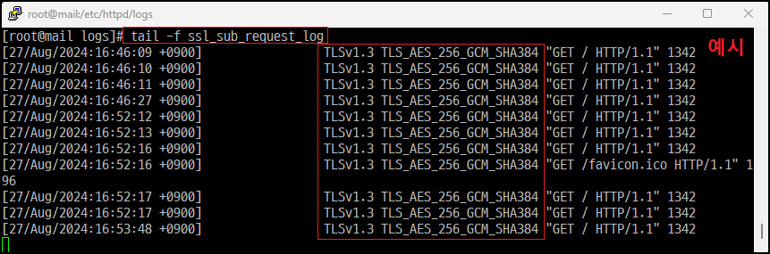 결과를 보면 인증서 파일 내용이 Base64 PEM 포맷 형태로 변경이 없다면 적어도 리눅스/유닉스 서버에서 확장자는 큰 의미가 없습니다. 발급자 마음대로 설정해도 Apache 환경설정에서 정보를 불러올 때 큰 문제는 없다는 것으로 판단됩니다. 애초에 문제가 있었다면 서비스 재시작할 때 에러가 발생합니다. 추가로 로그 「ssl_request_log」 기록을 활성화하여 실시간 접속 기록을 확인해 보면 정상적으로 TLSv1.3으로 응답하는 것을 알 수 있습니다.