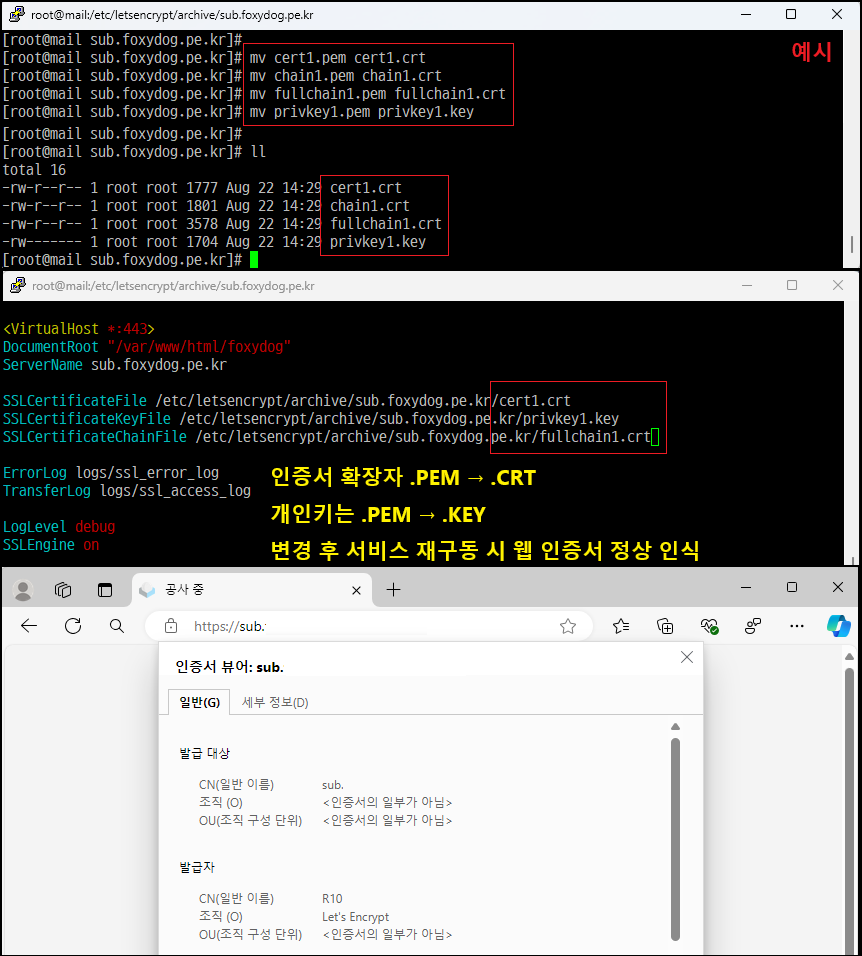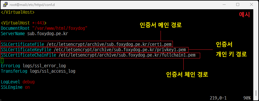 SSLCertificateKeyFile /etc/letsencrypt/archive/sub.foxydog.pe.kr/privkey1.pem [인증서(개인키) 경로 설정]