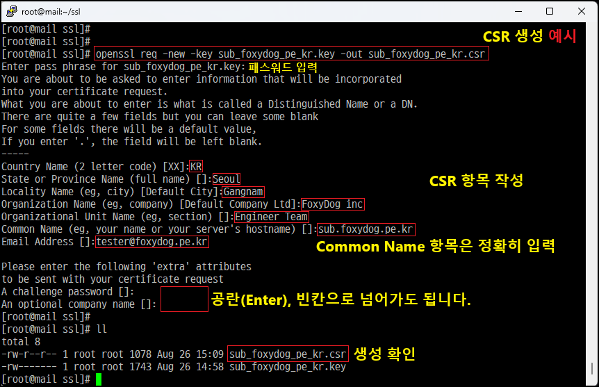 [root@]# openssl req -new -key sub_foxydog_pe_kr.key -out sub_foxydog_pe_kr.csr [CSR 생성]