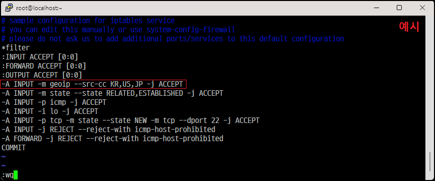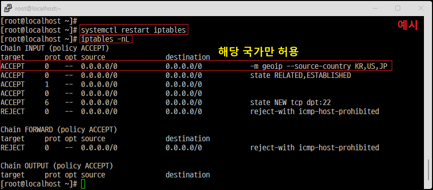 -A INPUT -m geoip --src-cc KR,US,JP -j ACCEPT [복수일 경우, 한국/미국/일본만 허용]