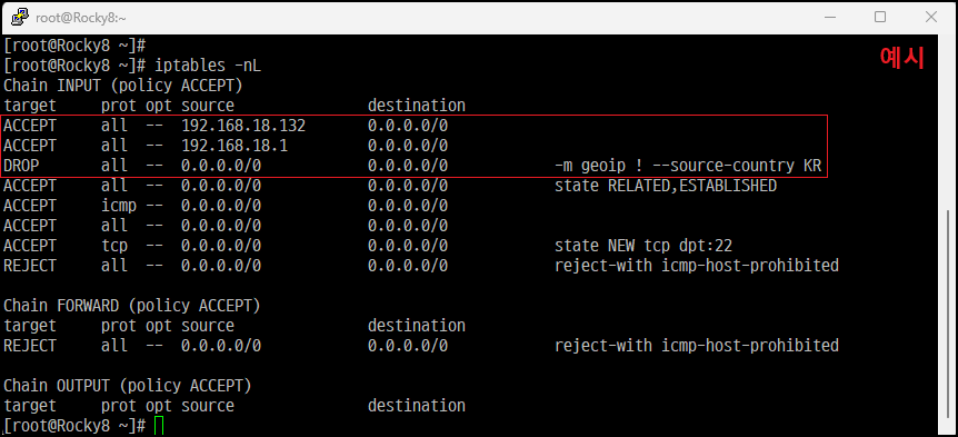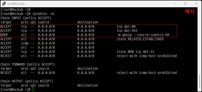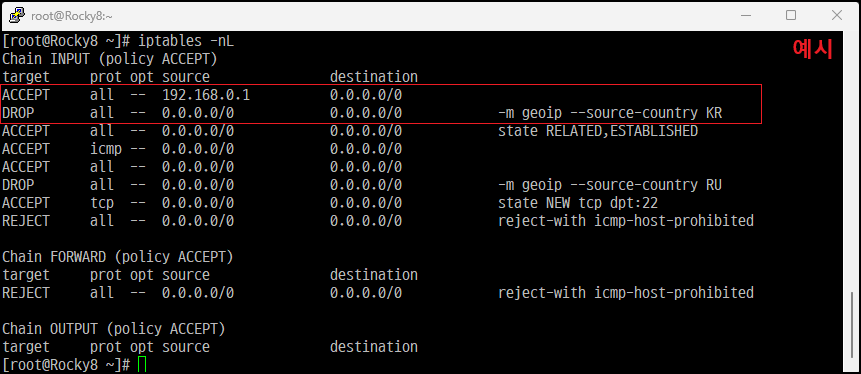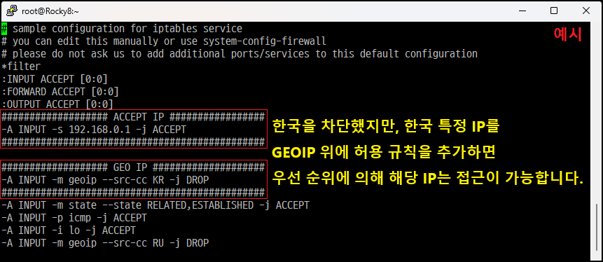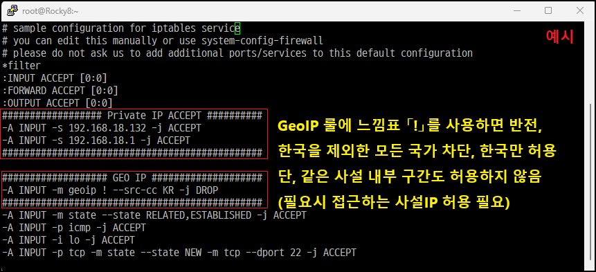 -A INPUT -m geoip --src-cc KR -j ACCEPT [한국만 허용]