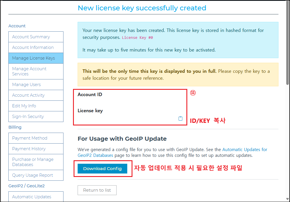 6. 성공하면 「Account ID/License key」 정보와 자동 업데이트 적용 시 필요한 설정 파일을 다운로드할 수 있습니다. ※ 해당 화면은 전체적으로 표시되는 유일한 시간으로, 키를 안전한 곳에 복사할 것