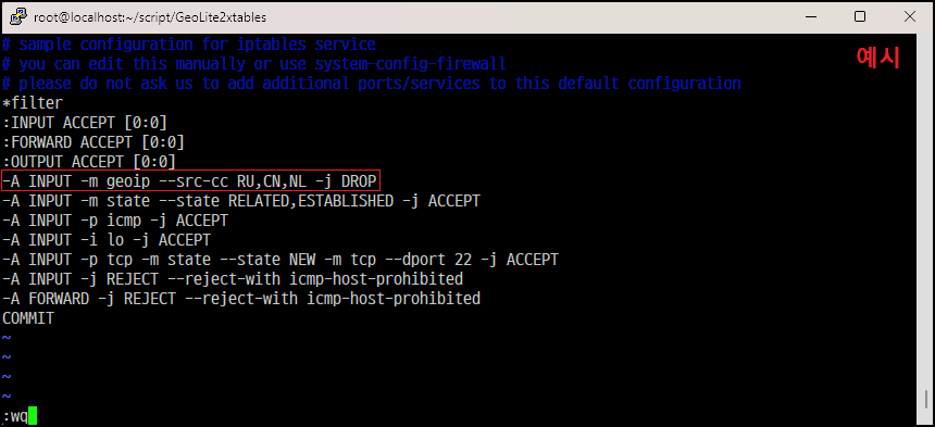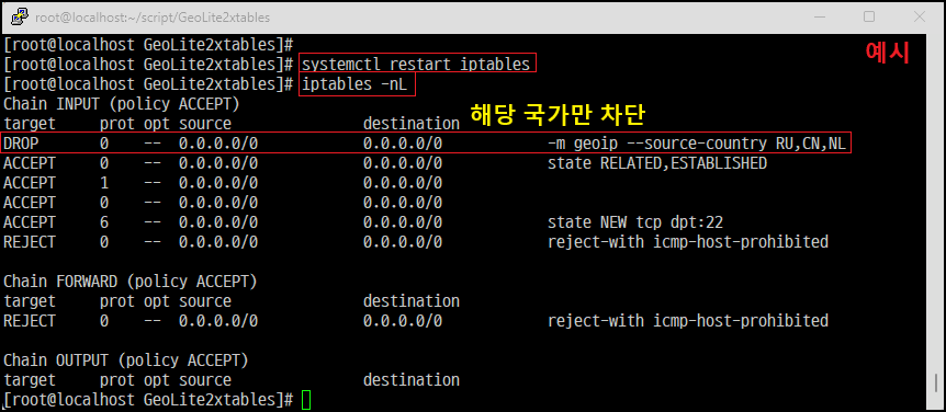 -A INPUT -m geoip --src-cc RU,CN,NL -j DROP [복수일 경우, 러시아/중국/네덜란드만 차단]