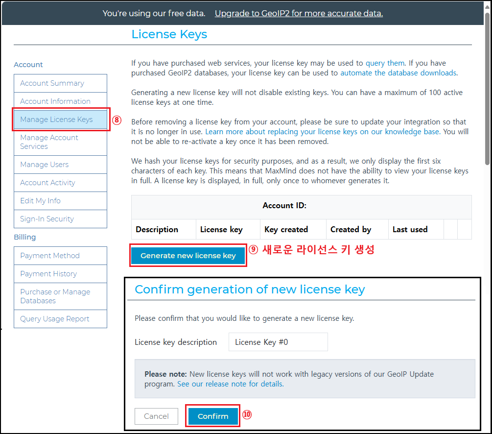 ③ MaxMind-GeoLite2 가입 및 라이선스 발급받기
