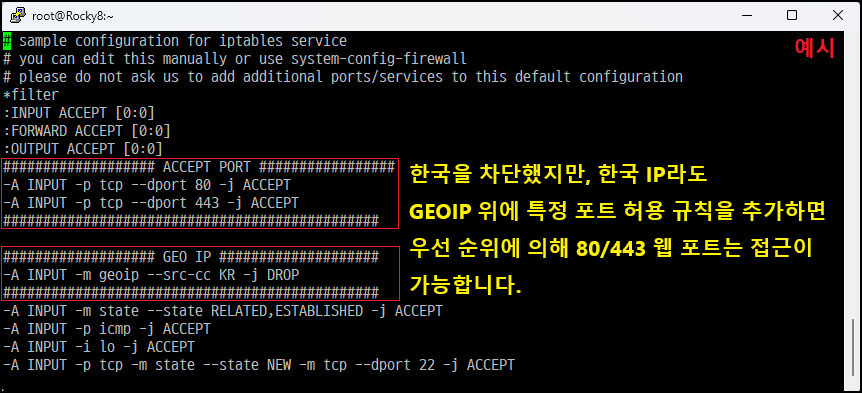 -A INPUT -p tcp --dport 80 -j ACCEPT [한국 IP 차단하더라도 해당 포트(80)로 접근 가능]