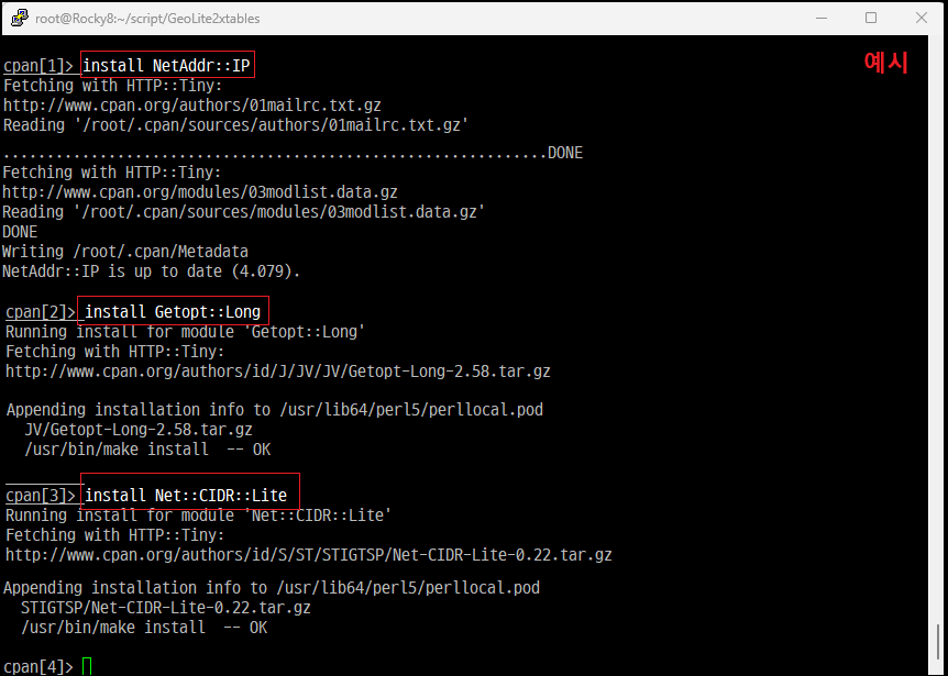 cpan [1]> install NetAddr::IP [Perl에서 IP 주소와 네트워크를 처리하기 위한 모듈]