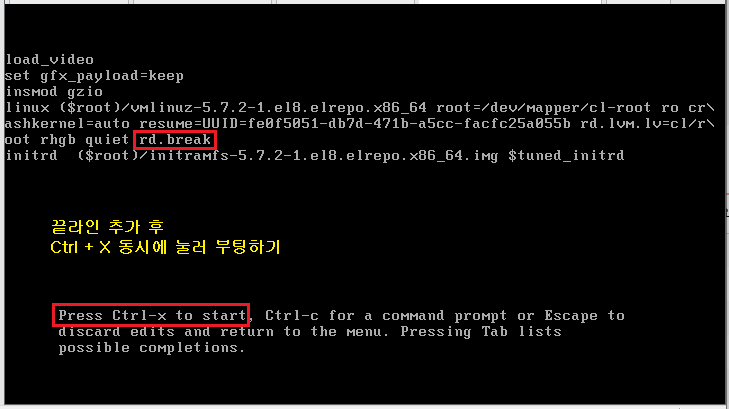 [ Kernel= ] 시작하는 끝부분에 [ rd.break ] 입력하고 [ Ctrl + x ] 동시에 눌러 부팅 프로세스를 실행합니다.
